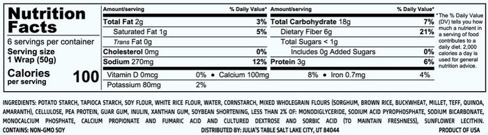 Our Original Wraps are top 7* allergen-free, certified gluten-free, an excellent source of fiber, and no added sugar! These soft wraps taste good and you can feel good because they are certified gluten-free, top 7* allergen-free, and vegan. Made with whole grain flours like sorghum, brown rice, buckwheat, millet, teff quinoa, and amaranth, we added some plant-based protein in there for good measure. The beauty of these wraps is that they perform just like any other wrap. Roll for a burrito – check! Fold for a quesadilla-check! Simply toast up in a pan- Yum!