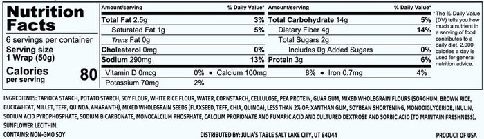 Our soft Super Seeds Wraps taste good and you can feel good because they are top 7* allergen-free, certified gluten-free, a good source of fiber, no added sugar, and vegan. They are loaded with whole-grain goodness, fiber, flaxseed, teff, chia, and quinoa. We added some plant-based protein in there for good measure. Made with whole grain flours like sorghum, brown rice, buckwheat, millet, teff quinoa, and amaranth. The beauty of these wraps is that they perform just like any other wrap. Roll for a burrito – check! Fold for a quesadilla-check! Simply toast up in a pan - Yum!